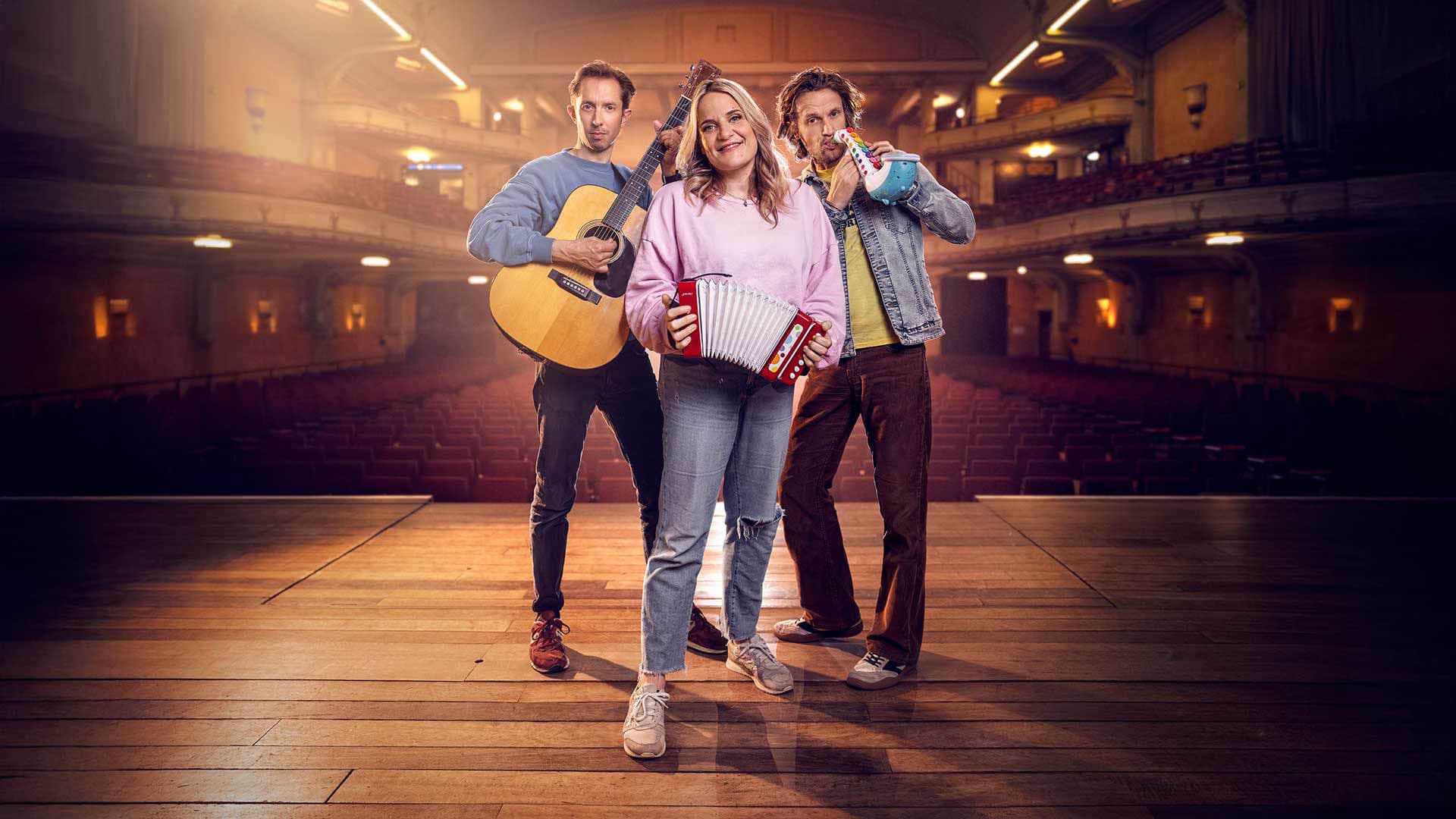Robrecht: “Aanvankelijk moest ik daar even over nadenken, omdat ik me realiseerde dat we het zouden moeten herdenken, met het risico dat we ergens anders zouden uitkomen en niet aan de verwachtingen zouden voldoen. Theater is tenslotte echt een ander medium. Maar al snel ontdekten we dat we dezelfde speelsheid en creativiteit konden brengen. Anders, maar ook heel erg leuk. En mét muziek — iets waar we alle drie meteen warm van werden.”