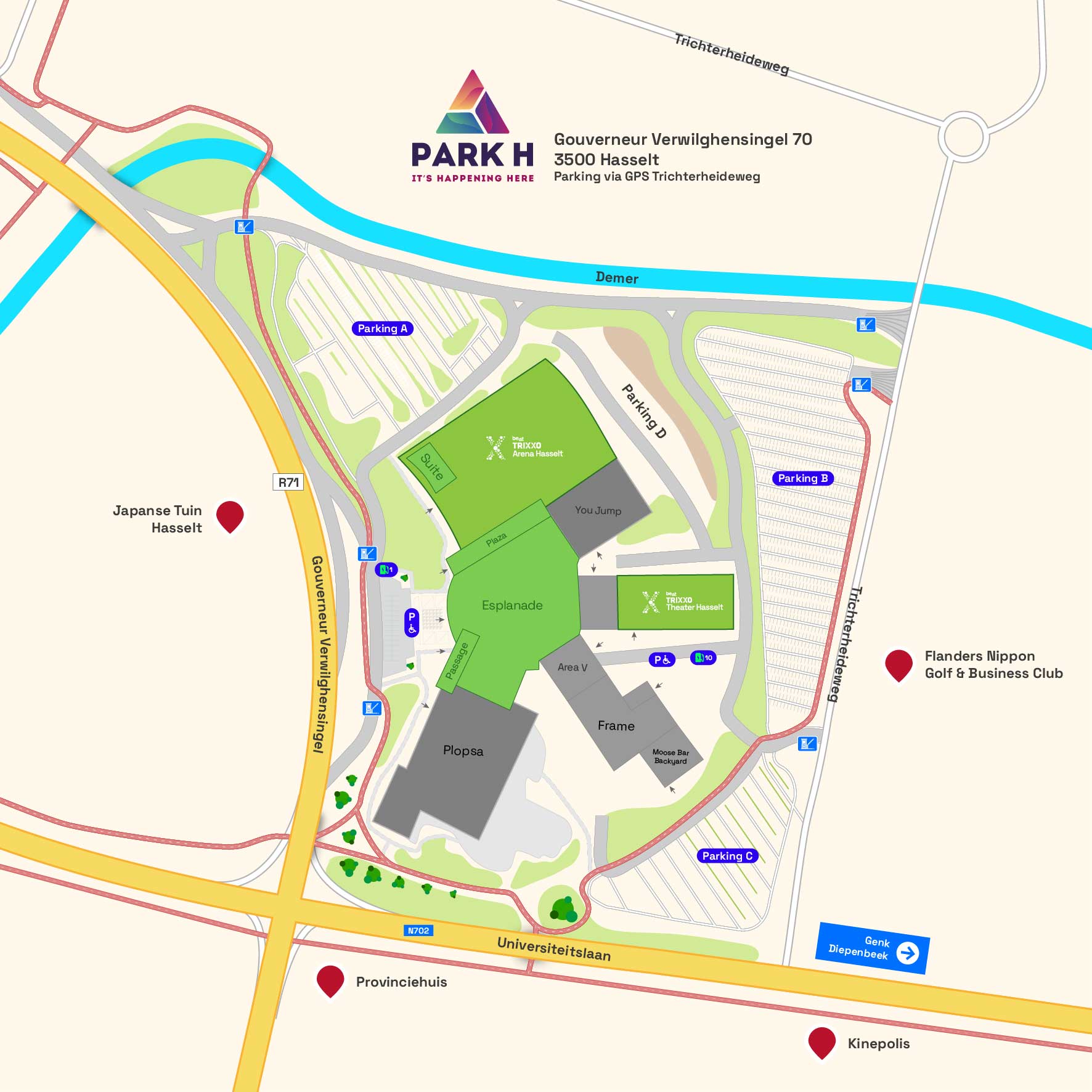Le Trixxo Arena se trouve dans le Park H, tout comme le Trixxo Theater, Plopsa Indoor, Versuz, le restaurant Bontà et You Jump.